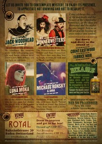 Die Atmosphäre alter Wanderzirkusse, Vaudeville-Theater und Kabaretts erstrahlt. Eleganz trifft auf Trash, und die Nacht wird zu einem ausgelassenen Maskenball, an dem sich das Publikum wesentlich beteiligt. Entstanden ist Cabaret Bizarre 2008 im Dreiländereck Basel in der Schweiz. Inzwischen gingen über 15 Shows in fünf Städten und drei Ländern über die Bühne – mit Ausstrahlung nach ganz Europa. Nun gastiert das Cabaret bereits zum zweiten Mal in Baden. Die Musik reicht von 20er-Jahre-Swing, über bodenständigem Rock’n’Roll bis hin zu dunkler Elektronik. Fernab des Konventionellen.