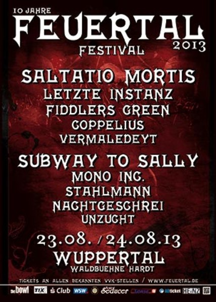 Das Line Up für nächstes Jahr ist bereits komplett. Am 23. August werden Saltatio Mortis, Letzte Instanz, Fiddlers Green, Coppelius und Vermaledeyt das malerische Gelände rocken, am Tag darauf bitten Subway To Sally, Mono Inc., Stahlmann, Nachtgeschrei und Unzucht zum Mitfeiern.